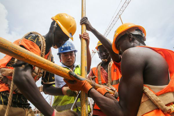 2016年4月,中国工程师和肯尼亚工人在蒙内铁路蒙巴萨西站工地上施工。蒙内铁路由中交集团总承包,中国路桥承建,连接东非最大港口蒙巴萨和肯尼亚首都内罗毕。(潘思危 摄)